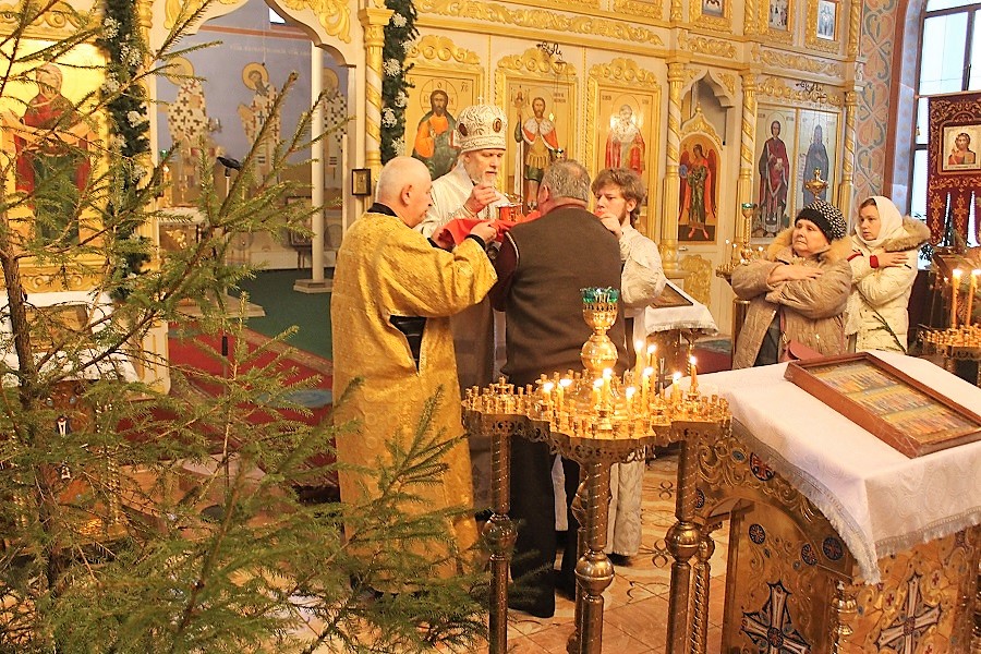 В завершении всего перед свечой в центре храма, которая символизирует Вифлеемскую звезду, были пропеты тропарь и кондак праздника Рождества Христова.
