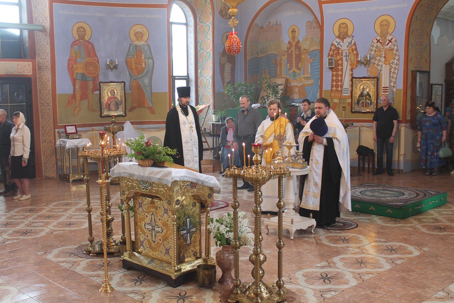 Его Высокопреосвященству сослужили: протоиерей Александр Рябов — настоятель собора, иерей Михаил Камышев и диакон Даниил Бойко – клирики собора.
